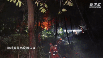 8月25日晚,在重庆市北碚区缙云山,消防救援人员在火场一线灭火。 新华社记者 黄伟 摄