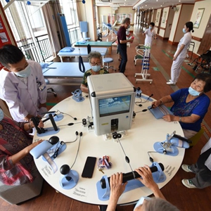 8月5日,在山东日照颐养公寓,医生指导老人通过手功能综合康复训练平台进行手指锻炼。新华社记者 范长国 摄