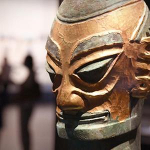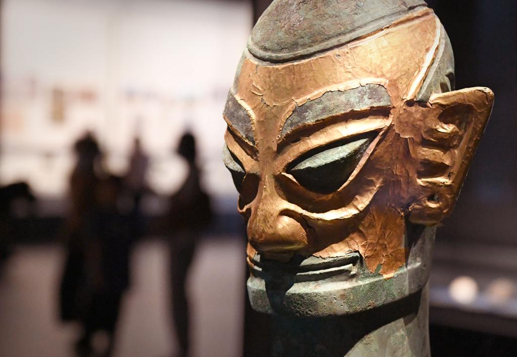 这是在中国百年百大考古发现展上展出的“戴金面罩青铜人头像”(9月4日摄)。新华社记者 李安 摄