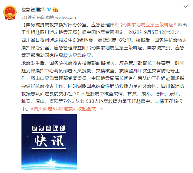 据中国地震台网测定,2022年9月5日12时52分,四川省甘孜州泸定县发生6.8级地震,震源深度16公里。接报后,国务院抗震救灾指挥部办公室、应急管理部立即启动国家地震应急三级响应,国家减灾委、应急管理部启动国家Ⅳ级救灾应急响应。