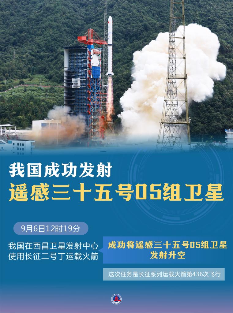 新华社西昌9月6日电(李国利、胡煦劼)9月6日12时19分,我国在西昌卫星发射中心使用长征二号丁运载火箭,成功将遥感三十五号05组卫星发射升空。卫星顺利进入预定轨道,发射任务获得圆满成功。