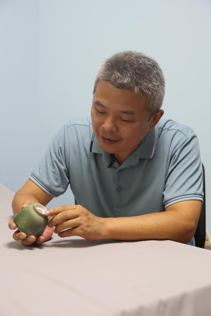 小心翼翼地托起一只清同治景德镇窑绿釉杯,翟杨称这件文物可以被命名为“001”号。绿釉杯小巧玲珑,底部有矾红彩书“同治年制”篆书款识。翟杨表示,这件出水文物的底款,对于长江口二号古船的年代判定起到了重要作用。