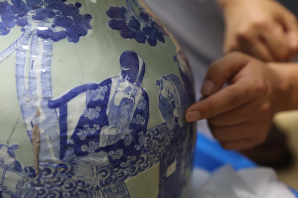 水下考古队伍还发现了一只体形硕大的清同治景德镇窑豆青地堆白青花松下高士图双耳瓶。这个瓷瓶高达60厘米,丰肩鼓腹,两侧有双狮耳饰,瓶身上以青花绘有松下高士图。专家解读称,这种款式流行于晚清民国时期,多用于陪嫁妆奁,民间俗称“嫁妆瓶”。令人惊喜的是,当考古人员一层层清理和收集瓶身里面厚厚的淤泥,准备用于今后进一步研究时,从“嫁妆瓶”里又连续取出了共计50只青花团龙纹杯。