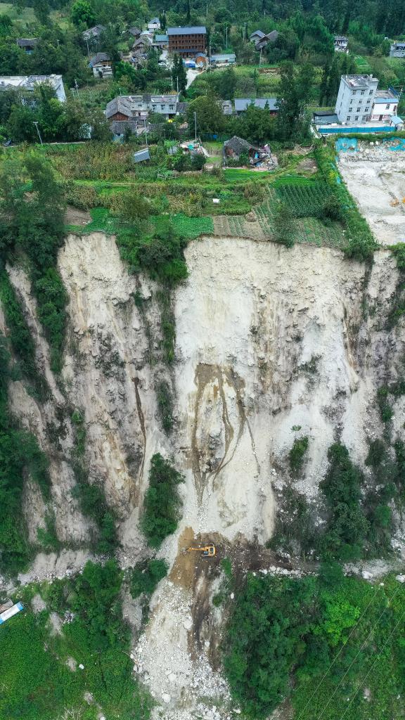 抢修位置在半山腰,距离下方河谷有近50米垂直落差。现场工人告诉记者,塌方的地方是个斜面,他们通过挖掘机把斜面分成多层,多台挖掘机同时在不同阶梯作业。在抢险过程中发生过几次余震,险峻绝壁不时有落石滚下。