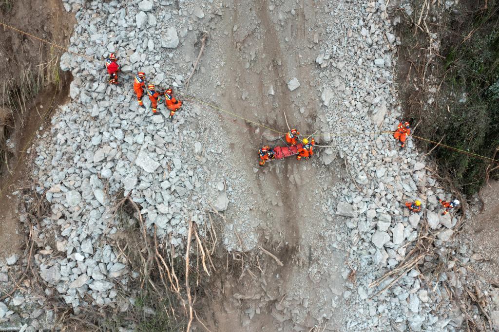 在垂直山体上,救援人员固定好绳索,踩出一条“小路”,帮助被困群众手抓绳索、顺着“小路”通过这段塌方路段。(记者:沈伯韩、杨进、康锦谦、薛晨、张海磊、萧永航,报道员:陈居伟)