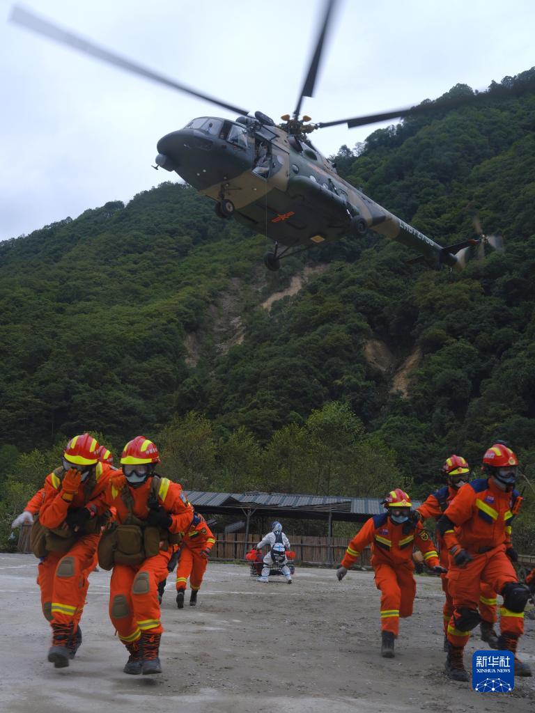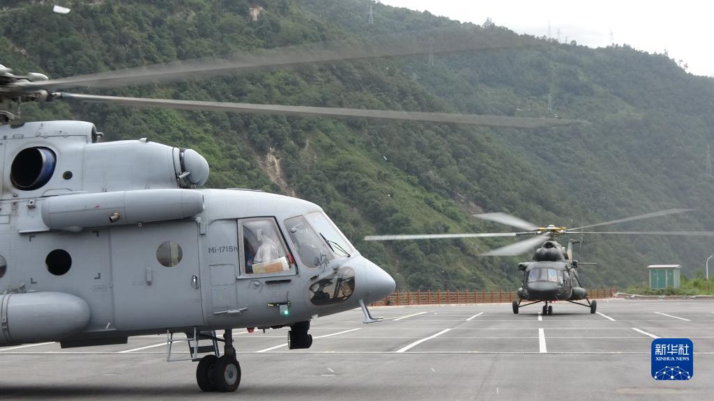 9月6日,西部战区空军运输搜救某团两架直升机抵达泸定县震中区域。新华社发(刘星宇 摄)