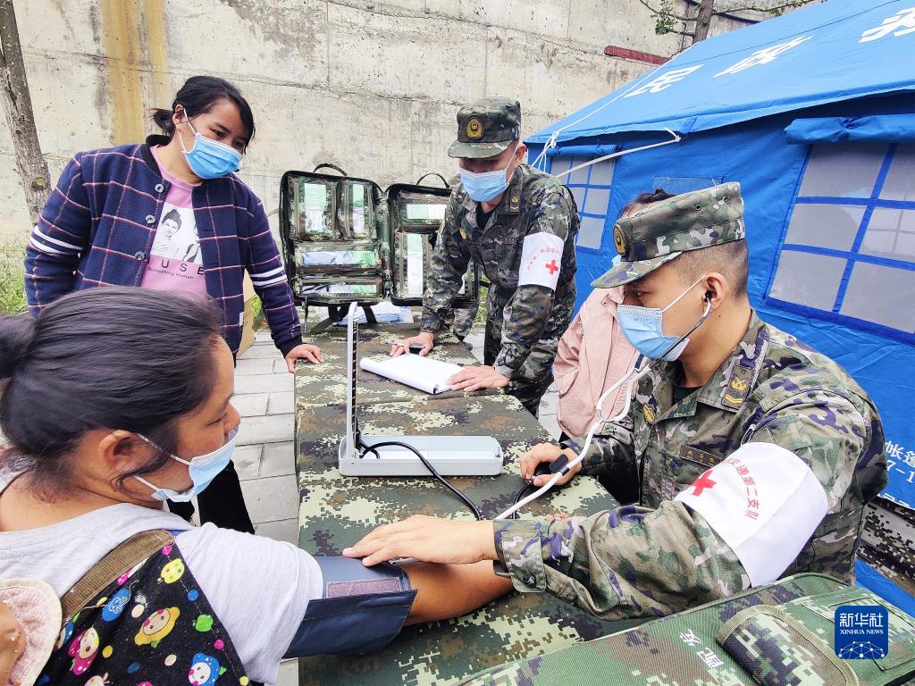 9月7日,武警第二机动总队某支队官兵为泸定县地震灾区群众开展巡诊活动。新华社发(李天标 摄)