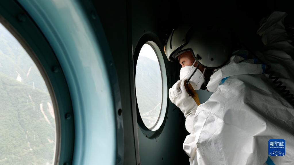 9月6日,西部战区空军运输搜救某团空中救生员在直升机上搜索被困群众。新华社发(胡建军 摄)