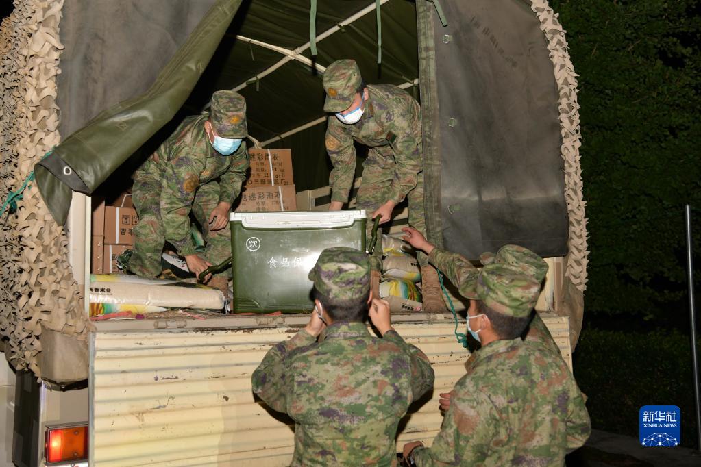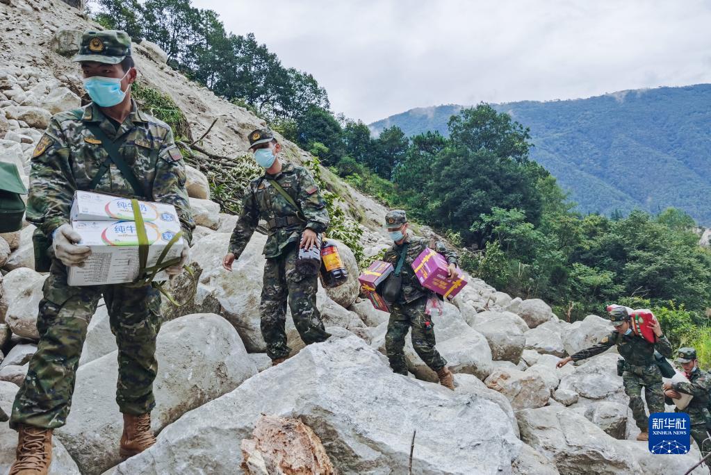 9月5日,西藏军区川藏兵站部官兵第一时间赶赴泸定县磨西镇,为灾区群众提供保障。新华社发(任云 摄)