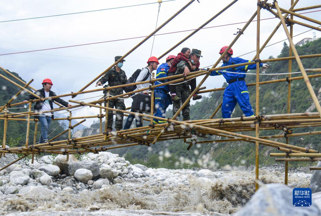 9月7日,武警四川总队甘孜支队官兵和地方救援队在泸定县磨西镇共和村利用刚建起的钢架桥转移受伤群众。新华社发(段力新 摄)