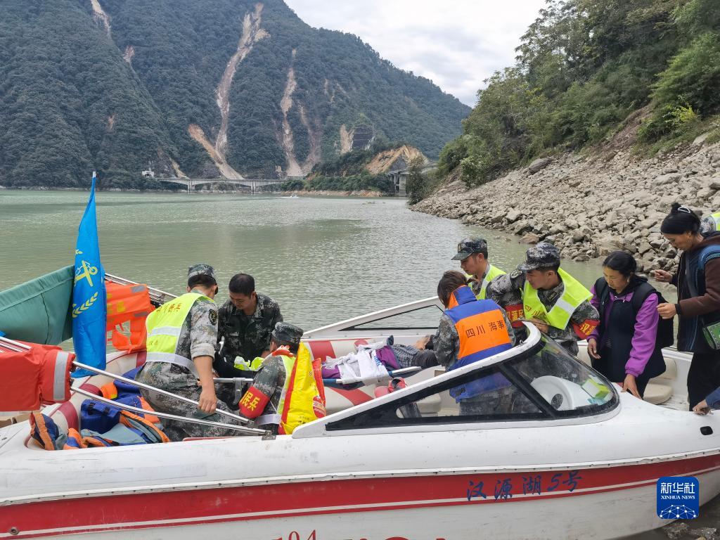 9月7日,汉源县人武部民兵将王岗坪乡跃进村的受伤老人转送至水面救援通道(手机照片)。新华社发