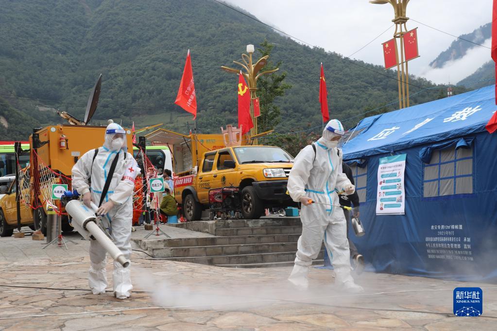 9月7日,武警四川总队医院医护人员在泸定县磨西镇贡嘎山王广场开展环境消杀工作。新华社发(李华时 摄)