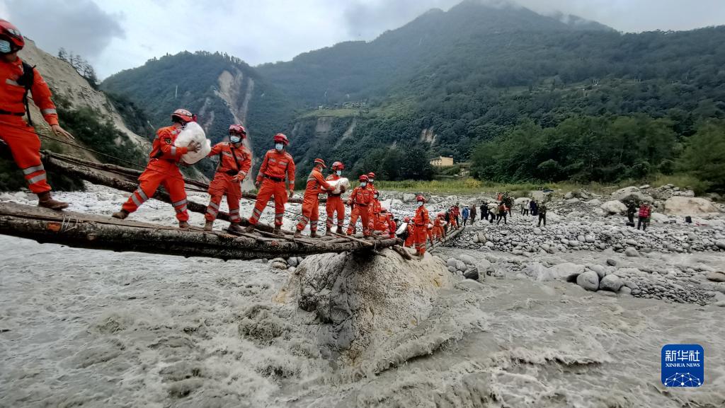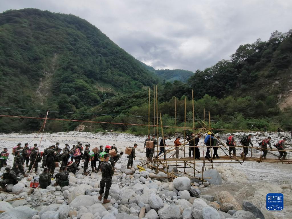 9月8日,武警四川总队机动第二支队利用简易木桥,为泸定县磨西镇青岗坪村的受灾群众搬运生活物资。新华社发(段力新 摄)