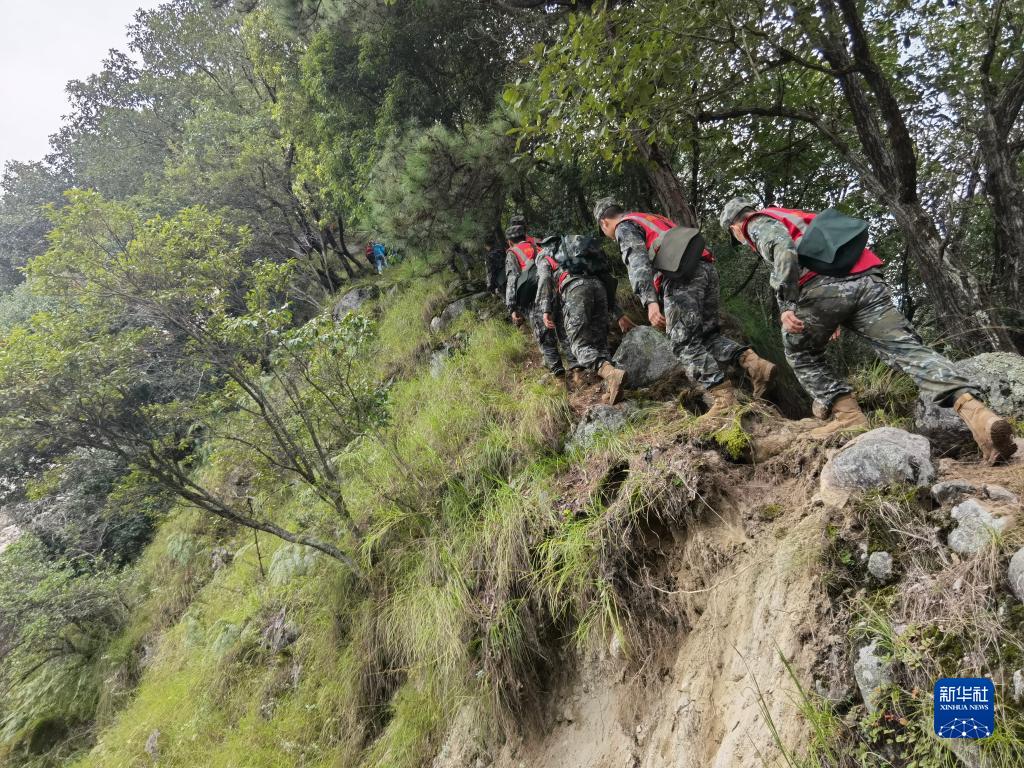 9月7日,武警四川总队雅安支队官兵沿着山脊开辟山路徒步挺进泸定县磨西镇共和村(手机照片)。新华社发(洪福乐 摄)