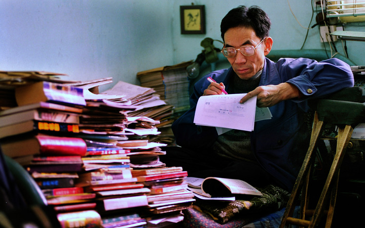 20世纪90年代,多家媒体登门拜访薛范,彼时他已是赫赫有名的翻译家了。不过,记者看到、拍到的他,完全没有“光环”。他戴着略显沉重的黑框眼镜、穿着蓝色粗布工装,废寝忘食,把整个自己深“埋”在作品的“海洋”里。