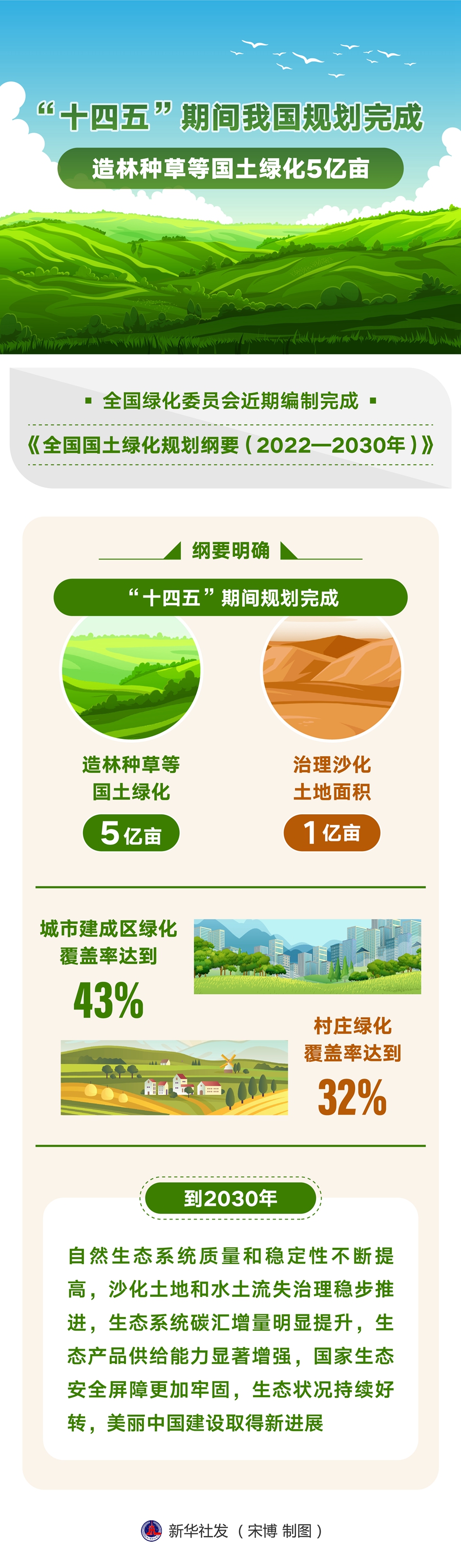 新华社北京9月9日电(记者胡璐)全国绿化委员会近期编制完成《全国国土绿化规划纲要(2022—2030年)》。国家林业和草原局生态保护修复司司长张炜9日表示,按照规划纲要,“十四五”期间我国将完成造林种草等国土绿化5亿亩。