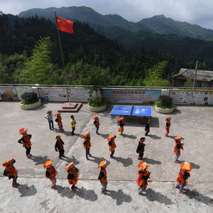 登晒小学师生在课间一起做游戏(2019年3月12日摄)。登晒小学地处黔桂边界,同属贵州省黎平县龙额镇和广西壮族自治区三江侗族自治县富禄苗族乡,是黔桂共建的一个教学点,师生有的来自贵州,有的来自广西,有“一校跨两省区、两省区辖一校”之称。