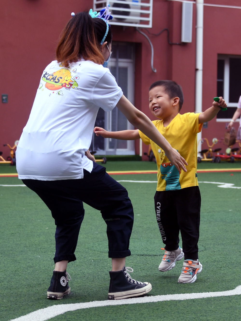 ↑2022年7月4日,在中国科学院第三幼儿园,小朋友与老师拥抱。