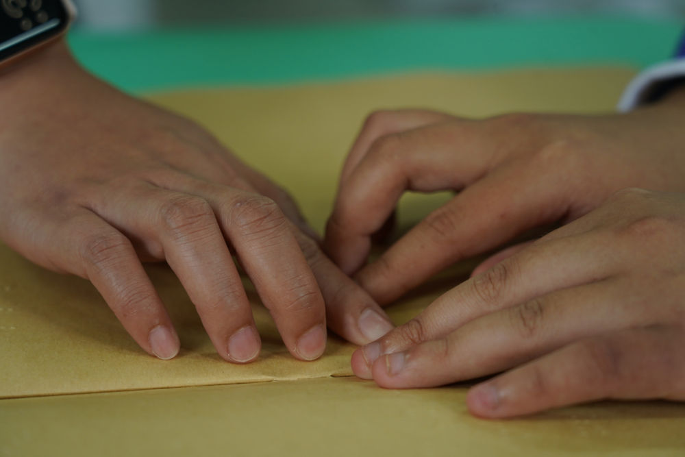 ↑2022年5月13日,江西省萍乡市特殊教育学校的特教老师贾君婷仙手把手地教一名学生认盲文。