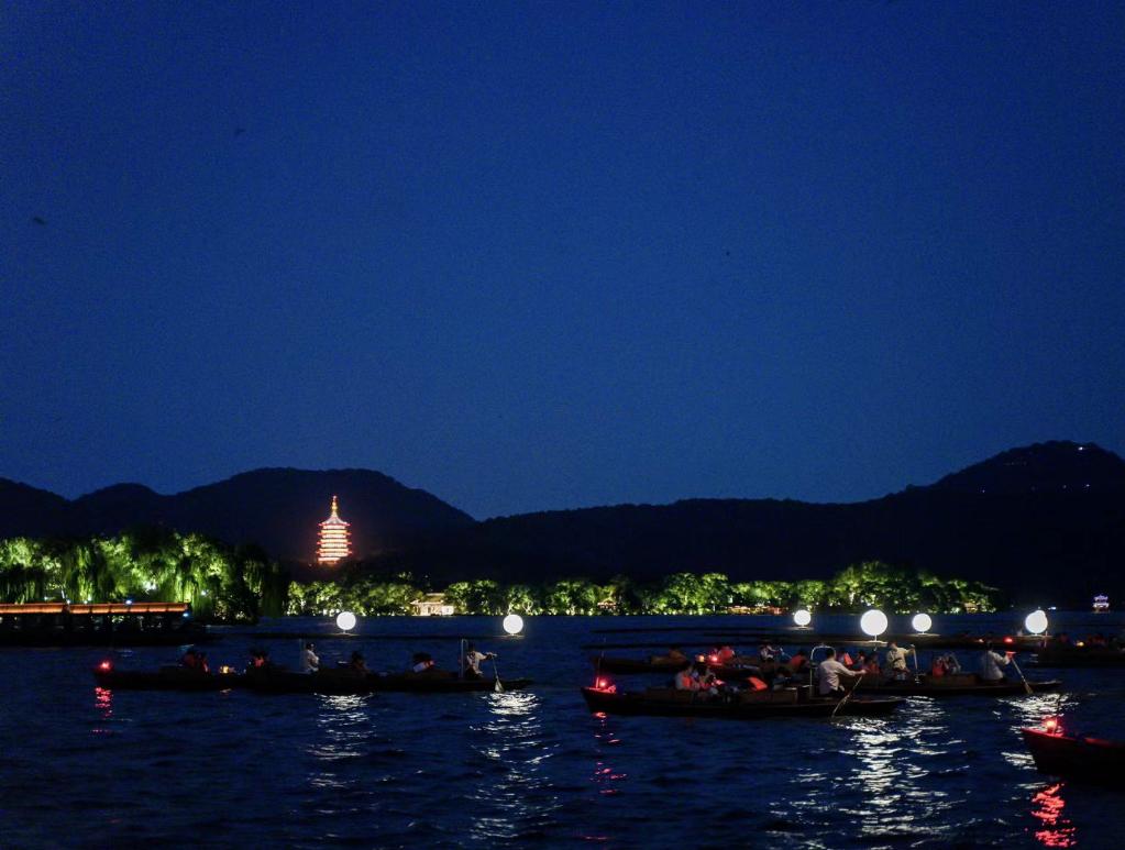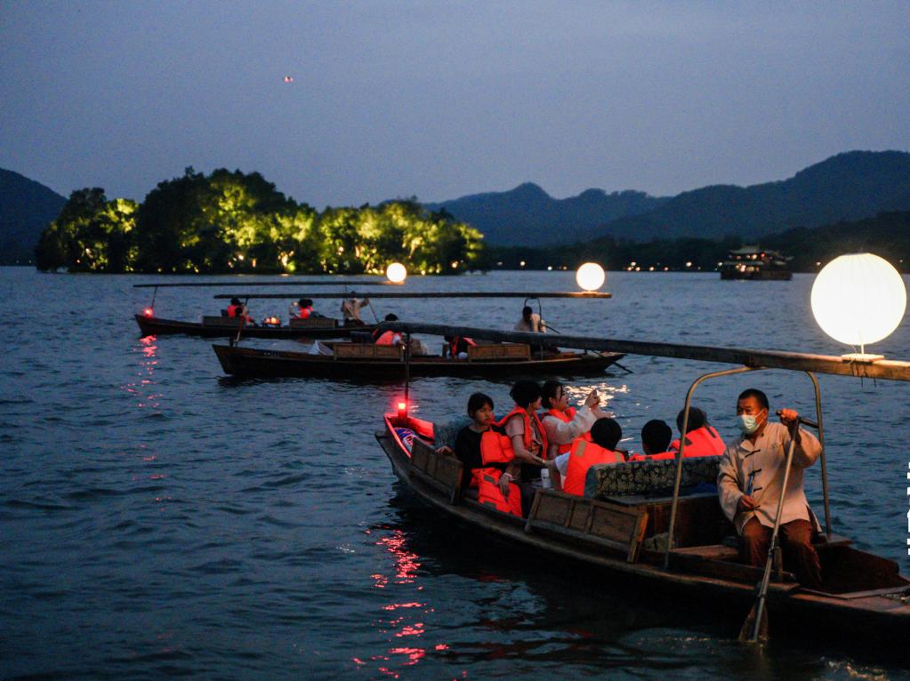 看着一艘艘“月亮船”在湖面荡漾,岸边的游客鲁女士不由感慨,“此刻的西湖诗意般地呈现了传统民俗,让我和家人感受到了这份中秋浪漫。”