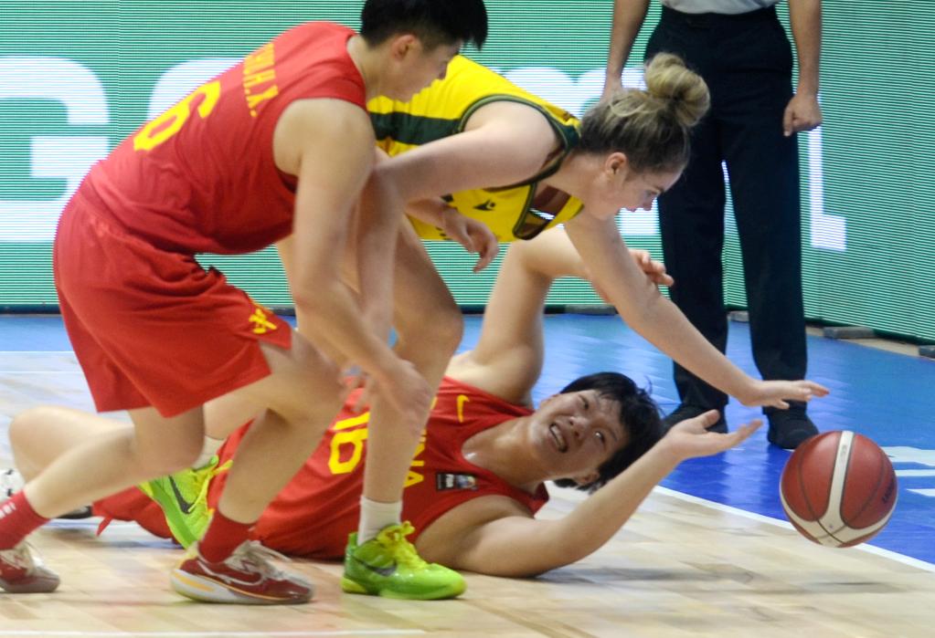 ↑中国队球员葛佳盈(下)、初慧萱(左)在比赛中拼抢。新华社发