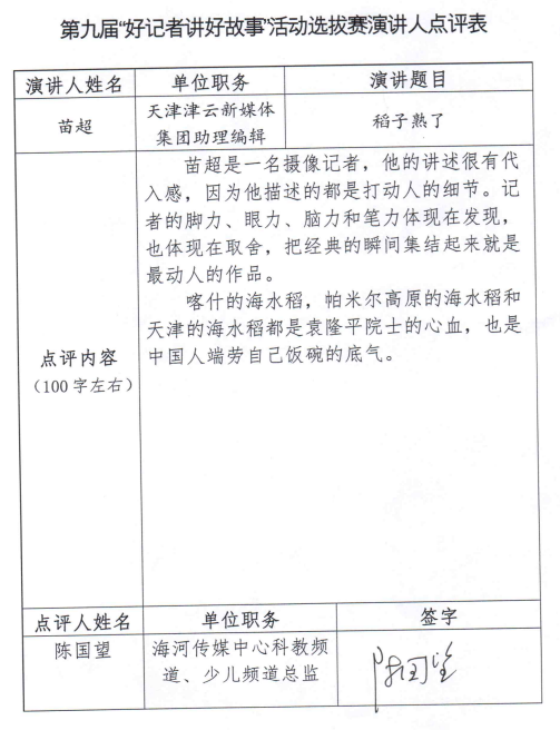 大家好我是来自津云的苗超。我的题目是《稻子熟了》,是一个关于中国饭碗的故事,是一个关于幸福的故事。