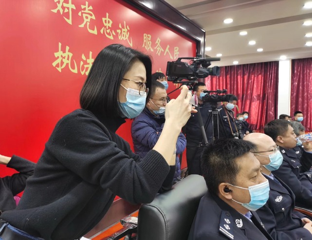 沈阳广播电视台肖夏 在沈阳市公安局新闻发布会上采访时照片