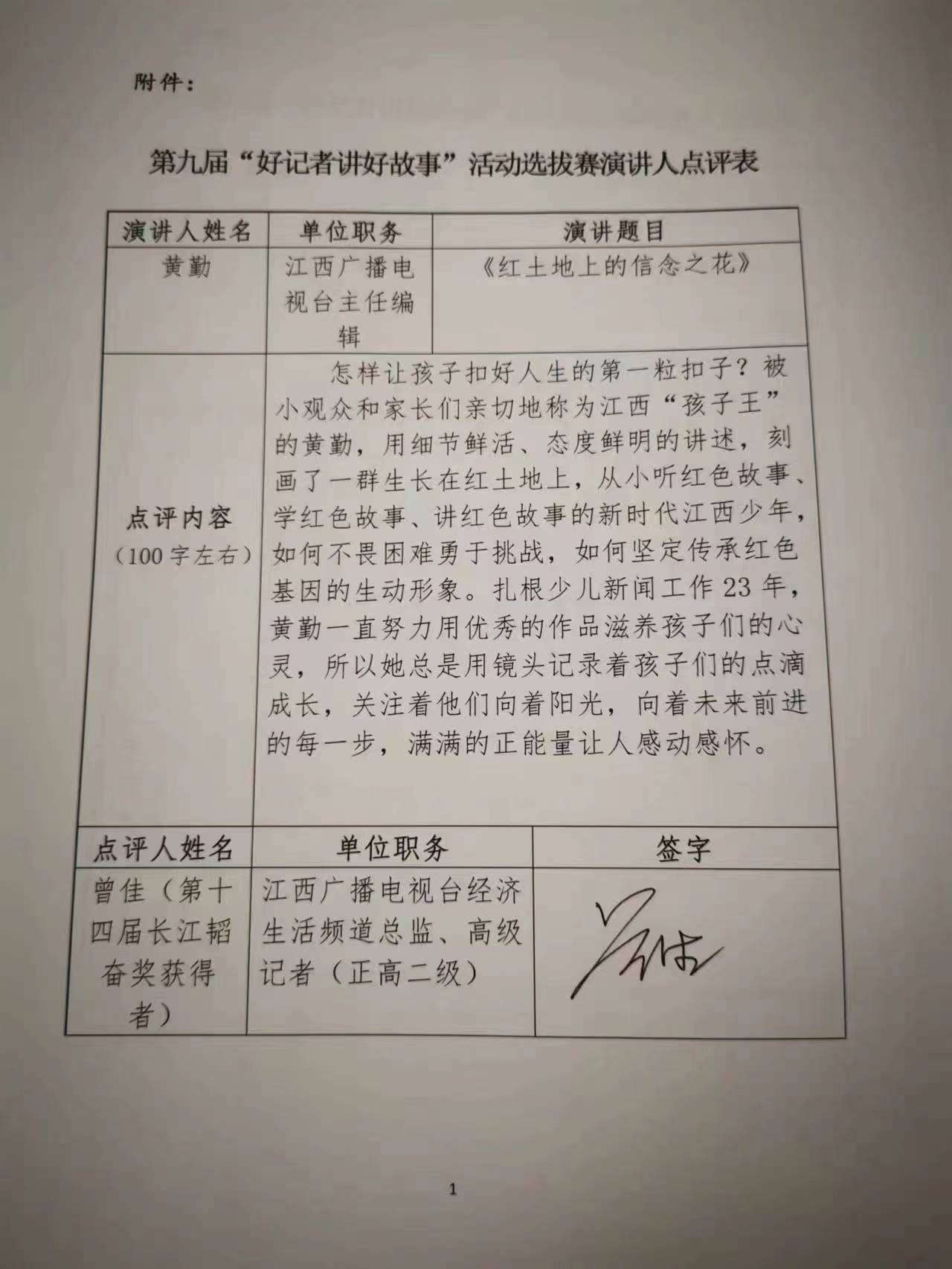 这就是我热爱并为之奉献的少儿事业,也许她不会被聚焦在舞台最中央,却会一直照亮每一个需要她的人。见证一代代孩子快乐成长,更收获孩子给我们的温暖与力量。少年强则国强!在镜头里记录传承红色基因的故事,在节目中点燃少年们的梦想;在青少年价值观形成和确定的关键时期,引导他们扣好人生第一粒扣子。好记者讲好故事,黄勤 一直在路上。感谢评委老师和各位同仁的聆听,谢谢大家!