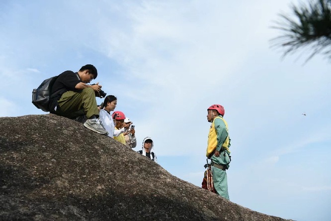 黄山山体陡峭、怪石嶙峋,有时放绳高度达七八十米,有三十层楼那么高。我问李培生怕吗?他说一开始还真怕,从小在鱼米之乡长大,第一次站在悬崖上双腿直哆嗦。但李培生生性“不服输”,通过刻苦训练和长期操作,如今他凭借一根关乎生命安危的绳索,在悬崖峭壁间行走自如。