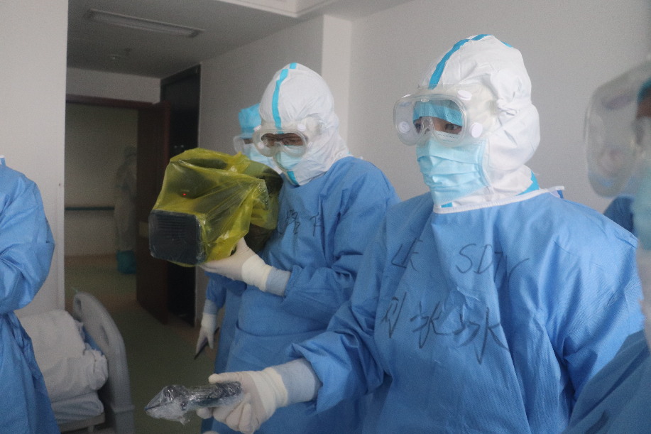 这张薄如蝉翼、拿在手中几乎没有重量的薄膜,在武汉、在上海,它成为我们摄像机的战衣,采访前,要做好充足的防疫措施,往往一场采访需要花费比平常多几倍的准备时间,因为凡是进到病区的物品都是污染物,只有经过层层消毒后,我才能把拍摄视频带出病区。教会我用保鲜膜包裹摄像机的,是2020年援鄂的一名医疗队员。那一年,全国各地的医疗队集结武汉,当时山东有7支医疗队、1186名医护在武汉,在这场没有硝烟的战争中,越来越多的人离开父母、子女、爱人,披上“战袍”奔赴战场。而我在其中,以笔为戈,以文战疫。