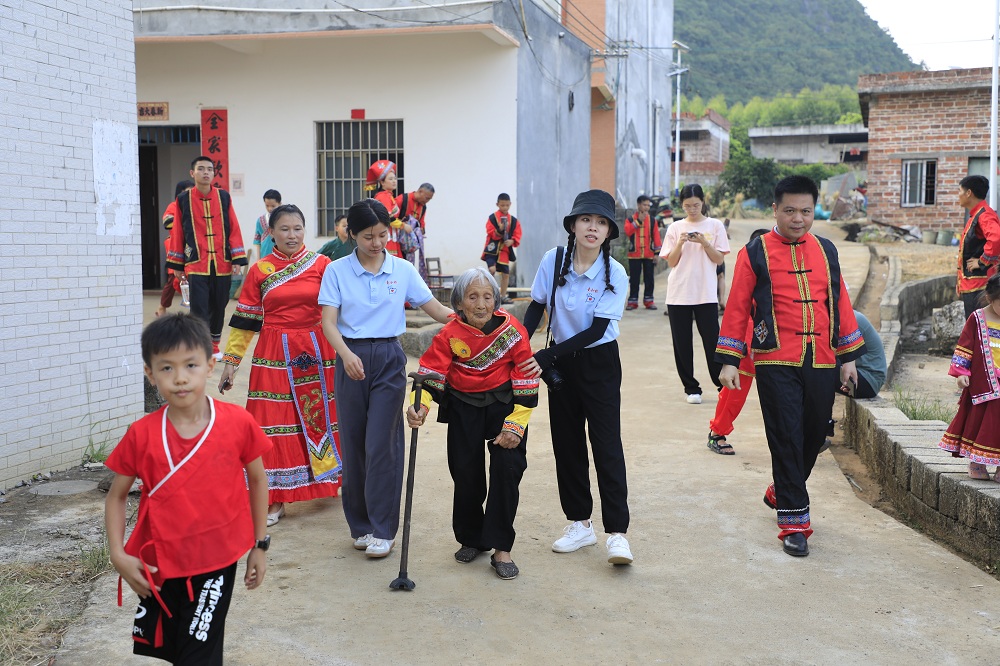 贵港日报社+曾茜茜+记者曾茜茜与同事正在为95岁壮族老奶奶的家庭进行公益摄影活动。