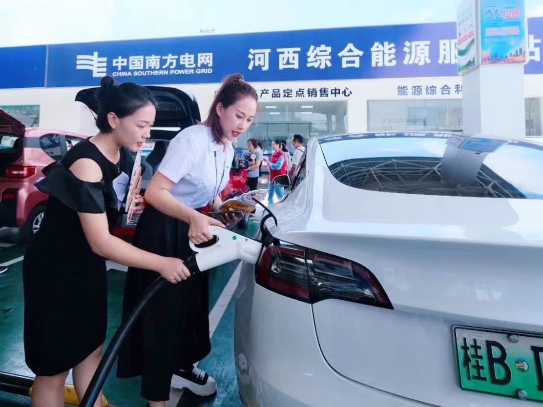 广西日报夏晓云2020年在柳州进行新能源主题直播采访时的工作画面