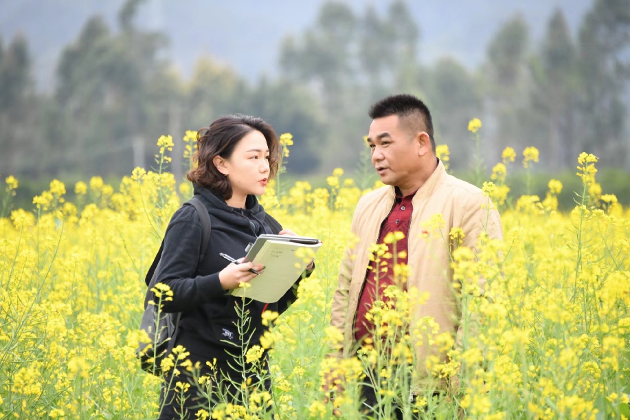 广西日报夏晓云2022年元宵节当天下乡进行乡村振兴产业采访工作时的场景
