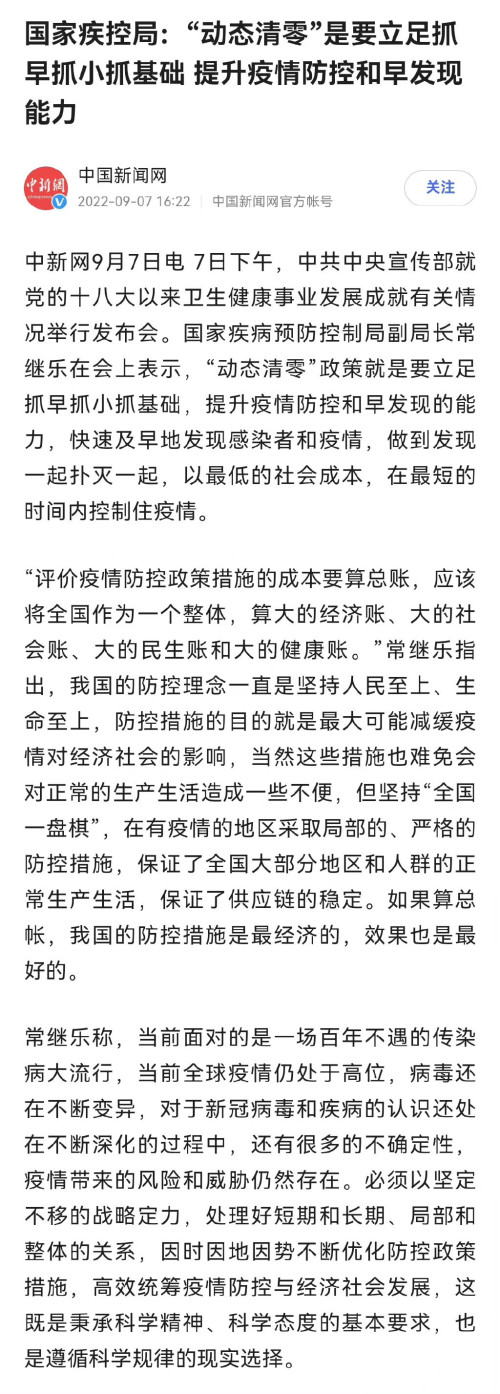 日前,一些地方媒体和医疗行业自媒体,甚至包括一些地方卫健、疾控部门的新媒体账号发文称,“动态清零”将作为一项基本国策长期坚持下去。