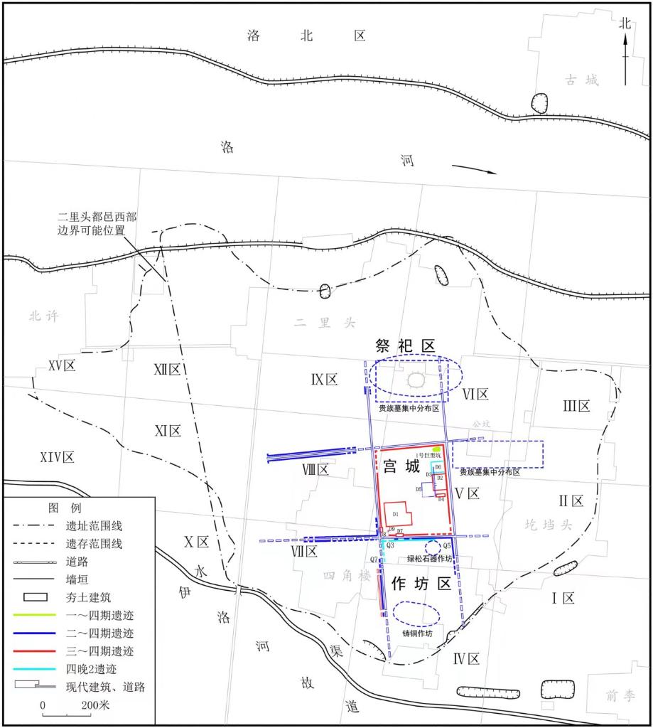 近年来进行的考古工作逐步揭开了二里头遗址的多网格式布局。在此基础上,2021年以来,考古工作者陆续揭露了多处城市道路和道路两侧夯土墙,包括宫城北侧道路上的门道、宫城西部围墙,并发现宫城西侧道路夯土墙向北延伸200余米,据此推测已知作坊区、宫殿区、祭祀区以西至少各存在一个分区。