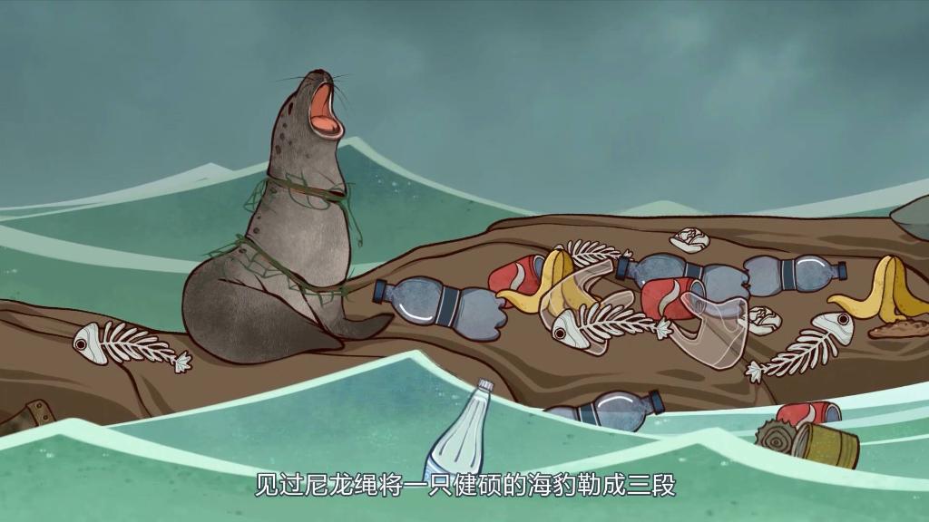 一个塑料矿泉水瓶被人类随意丢弃后,在海洋中漂泊,看到了被渔网死死缠住的海龟;