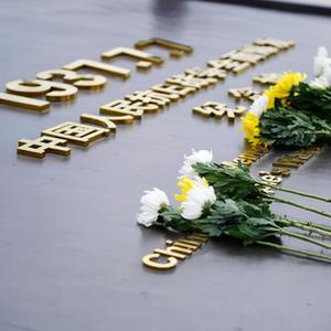 9月18日,中国人民抗日战争纪念馆的工作人员向独立自由勋章雕塑献花。新华社记者 张晨霖 摄
