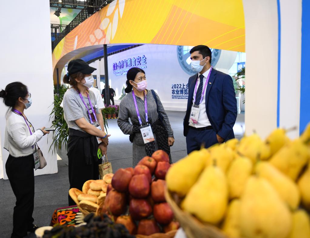 9月15日,参观者在塔吉克斯坦展区了解特色水果。(新华社记者邹竞一 摄)