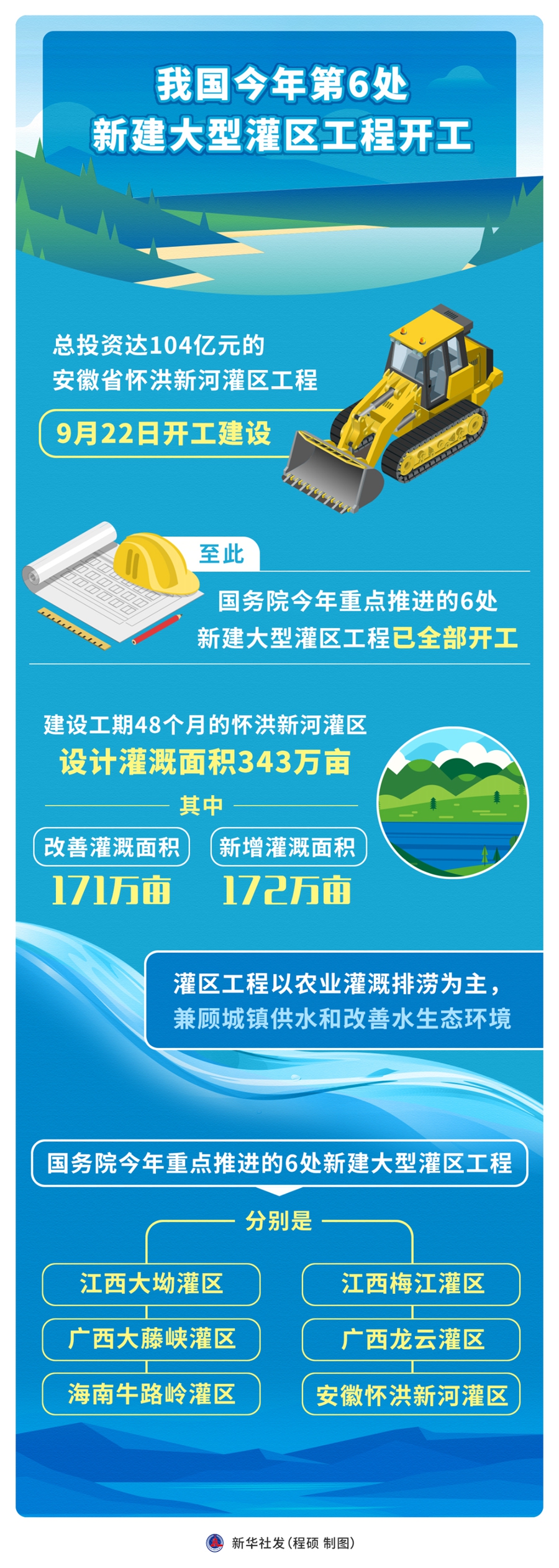 新华社北京9月22日电(记者刘诗平)总投资达104亿元的安徽省怀洪新河灌区工程22日开工建设。至此,国务院今年重点推进的6处新建大型灌区工程已全部开工。