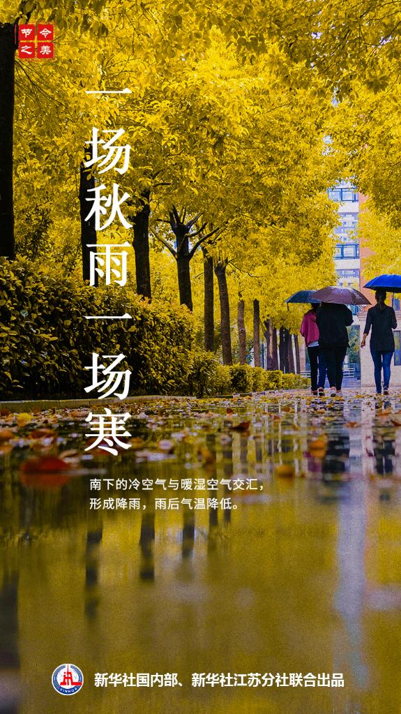南京信息工程大学应用气象学院副教授江晓东说,秋分是秋季的第四个节气,一个分字也有平分秋季之意。此时我国大部分地区气温相较白露时明显降低,长江中下游地区开始进入气象学上的秋天。南下的冷空气与暖湿空气交汇,形成降雨,雨后气温降低,“一场秋雨一场寒”。
