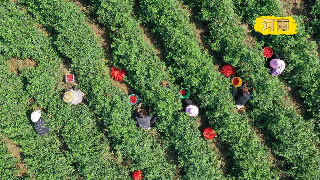 2022年9月1日,河南省宝丰县石桥镇竹园村农民在田间收获草莓椒(无人机照片)。新华社发(何五昌摄)