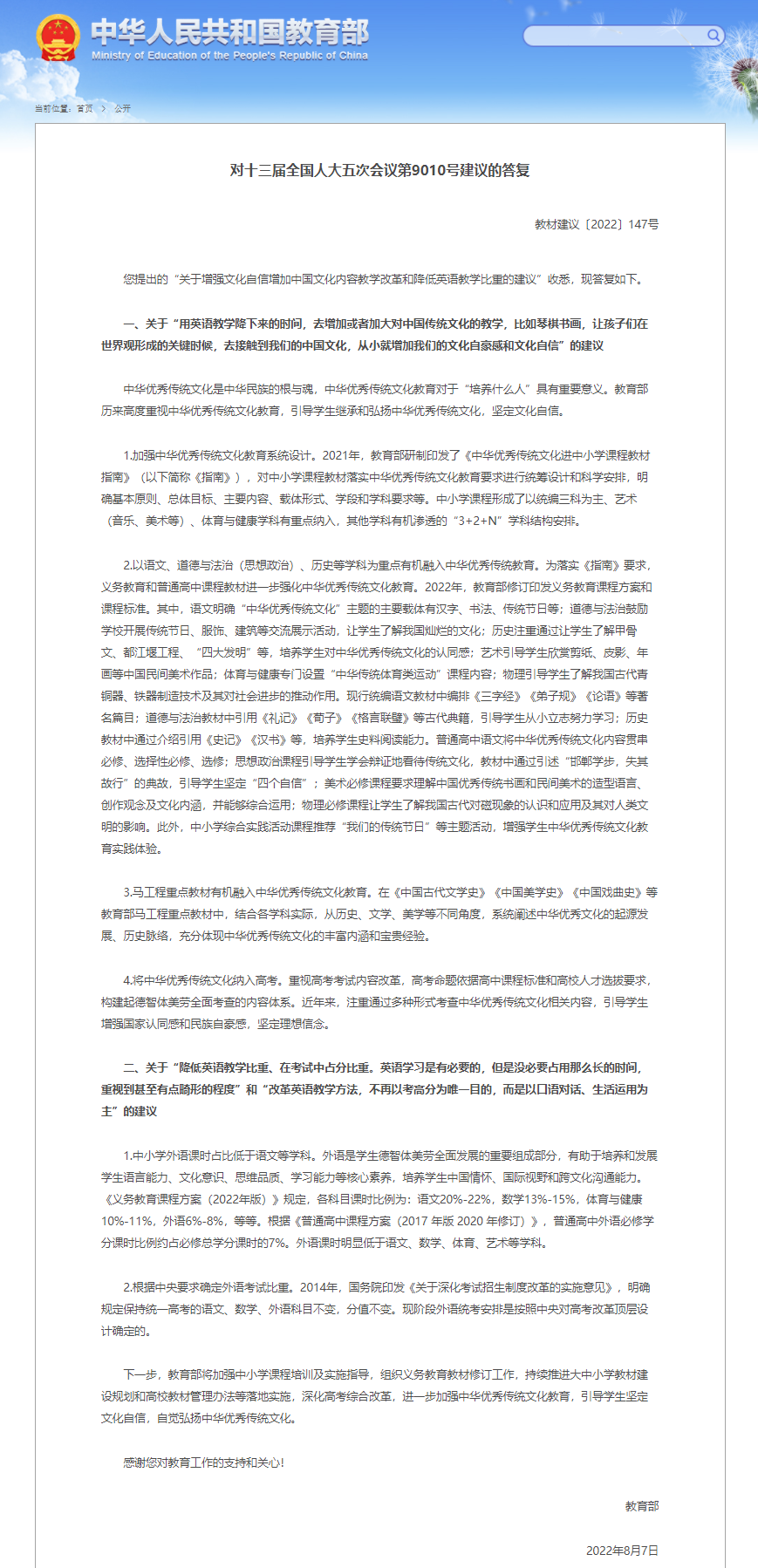 中国教育部日前在其官方网站公布了对全国人大代表提出的“关于增强文化自信增加中国文化内容教学改革和降低英语教学比重的建议”的答复。