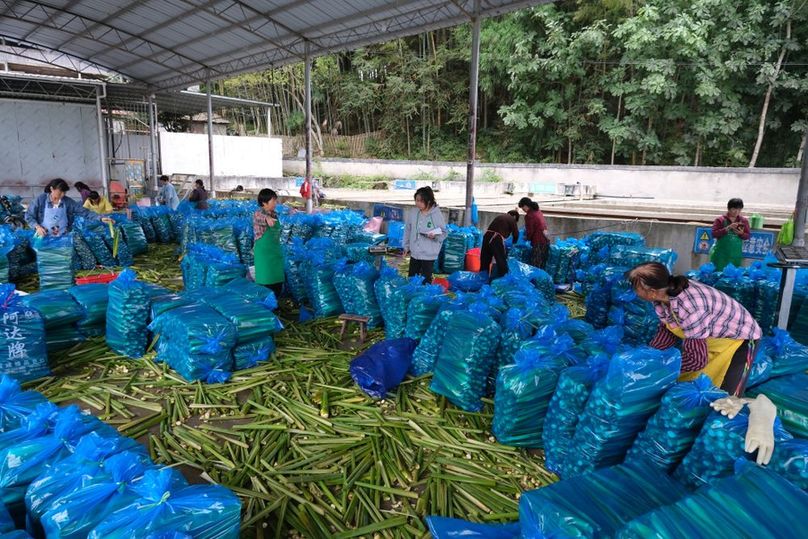 在丽水市景宁畲族自治县大漈乡茶林村,新采的茭白正在被打包装车。新华社记者 郑梦雨 摄