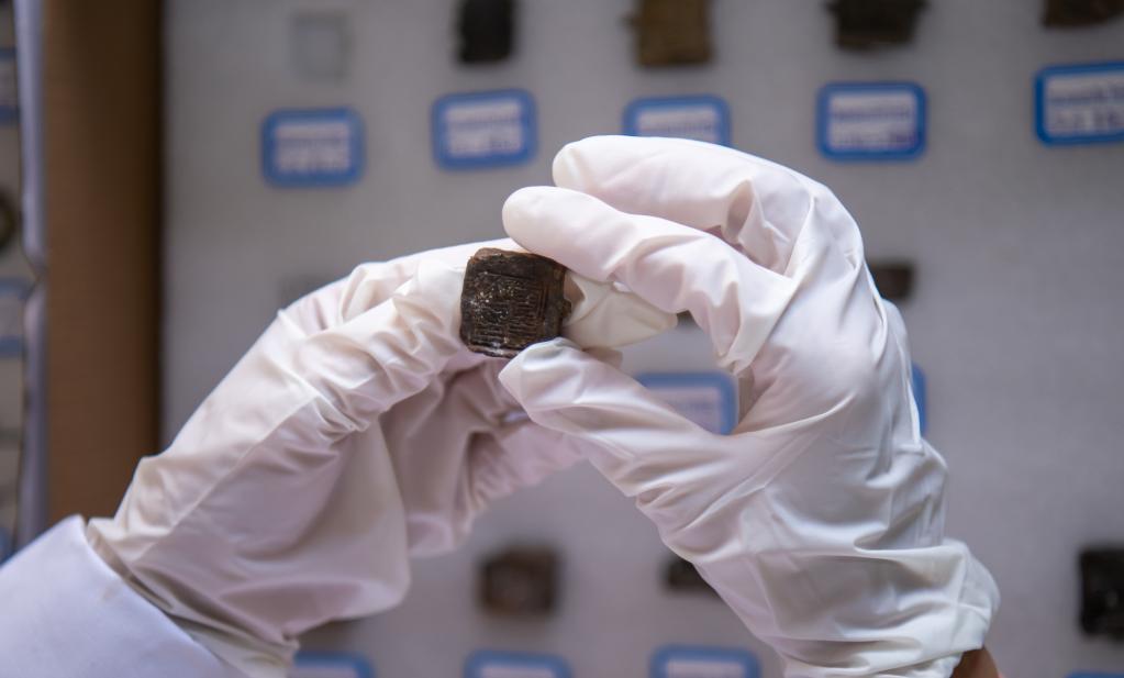 考古工作者在检查云南河泊所遗址出土的封泥(9月21日摄)。新华社记者江文耀摄