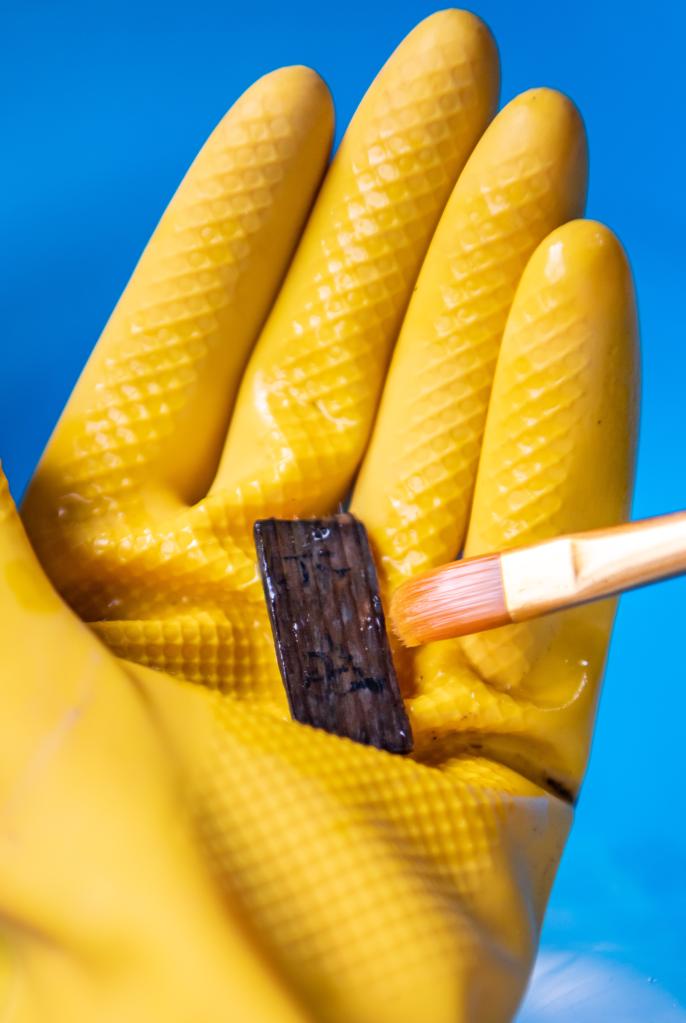 考古工作者在清理云南河泊所遗址出土的简牍(9月21日摄)。新华社记者江文耀摄
