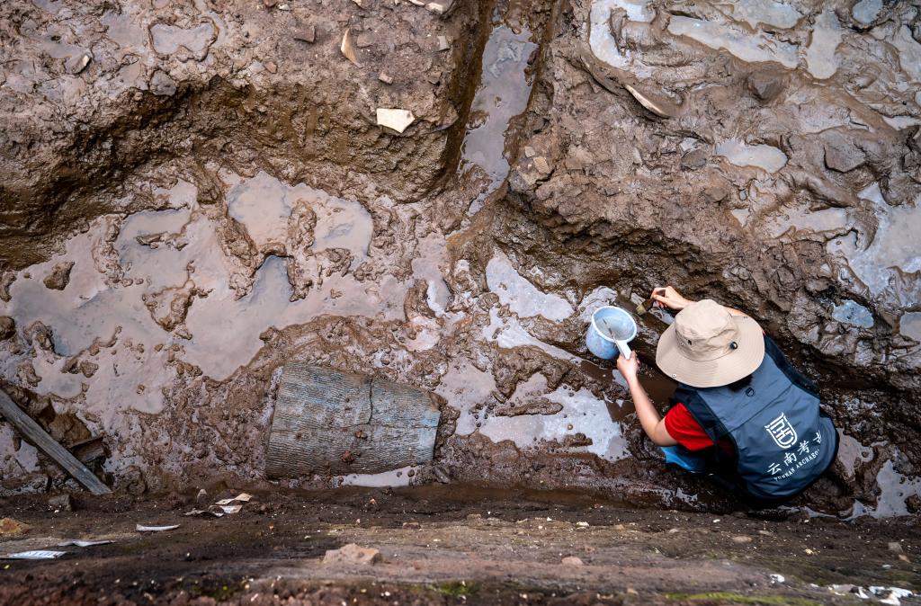 考古工作者在云南河泊所遗址现场进行清理发掘工作(9月21日摄)。新华社记者江文耀摄