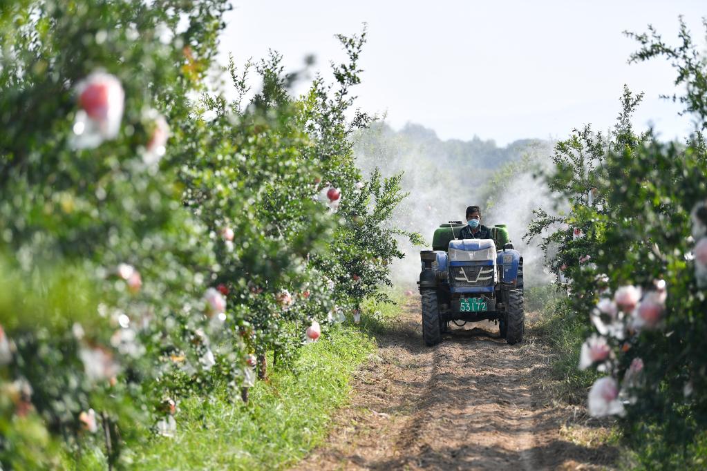 工作人员正给石榴树喷洒生物酵素(新华社记者张博文 摄)