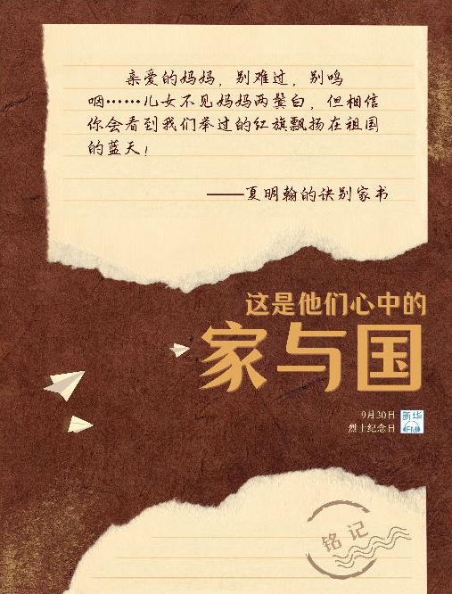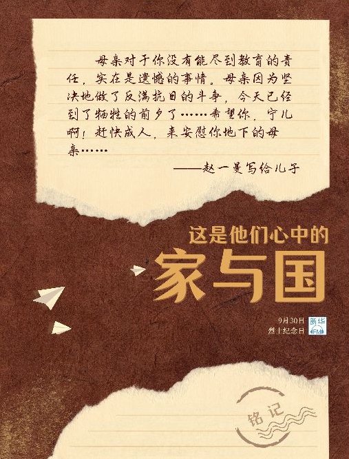 家书,是中华民族的情感档案,也是更为鲜活的历史。而烈士的家书,更承载着他们本真的生命、炽热的情感、至深的亲情,还有永不动摇的信念。9月30日是第九个烈士纪念日,让我们重温烈士家书,触摸他们心中的家与国。