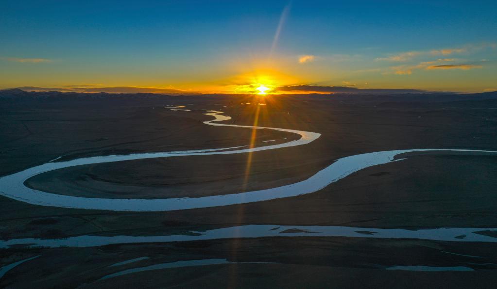 2021年11月27日,在四川省阿坝藏族羌族自治州若尔盖县,黄河在落日余晖映照下壮美如画(无人机照片)。新华社记者 王曦 摄