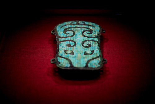 这是2019年10月19日在二里头夏都遗址博物馆内拍摄的展品“镶嵌绿松石兽面纹铜牌饰”。新华社记者 李安 摄